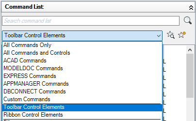 - In the Command List pane, Categories drop-down list, select Toolbar Control Elements.