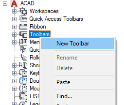 <file name> pane, right-click the Toolbars node and click New Toolbar.