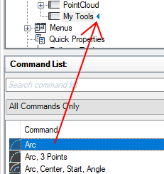 - In the Command List pane, drag the command you want to add to the toolbar in the Customizations In