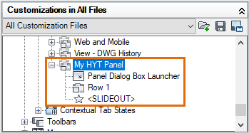 In the CUI Editor, locate the newly created ribbon panel (My HYT Panel), if necessary.