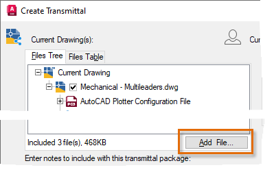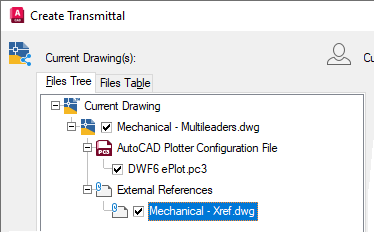 When you use the eTransmit feature, the current drawing is scanned for any referenced files and displays those files in the Create Transmittal dialog box.