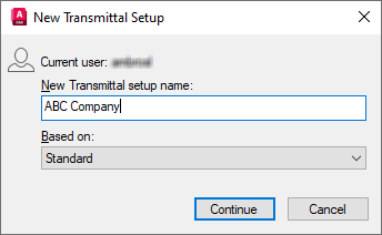 In the New Transmittal Setup dialog box, New Transmittal Setup Name text box, replace the default name with ABC Company. Click Continue.
