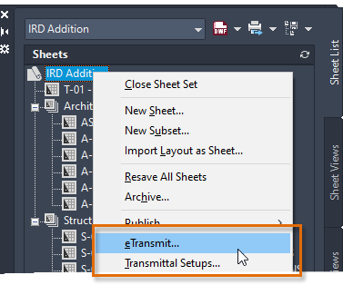 Note: The Sheet Set Manager contains an Archive option which is like the eTransmit feature, but offers less options related to cleaning up drawings since the purpose is to backup all files.
