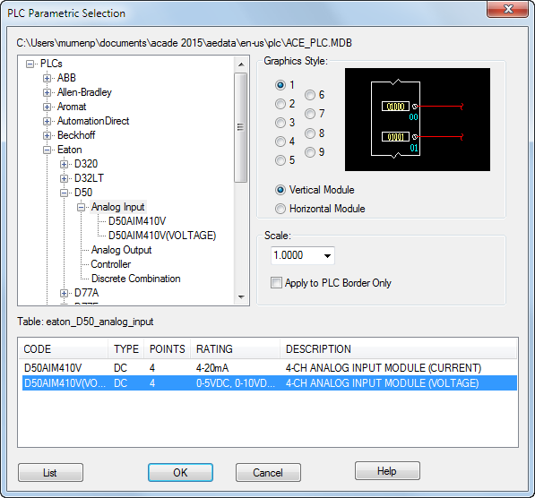 Expand the manufacturer, series, and type to find the PLC module. Select the PLC style if different from the drawing default. Select the module and click OK. Select an insertion point using the module outline to help with placement. Answer the prompts which can include rack, slot, first address, and more.