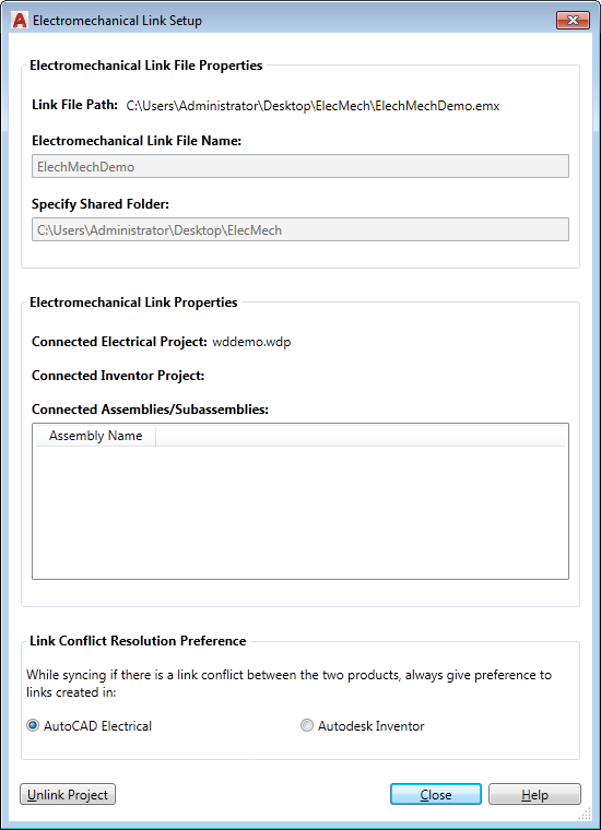 Create an electromechanical link file that connects an AutoCAD Electrical toolset project to an Inventor project.