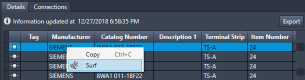 To surf on a wire number, click Display Details and Connections and click the Connections tab. Select a row, or group of rows, right-click and select Surf.