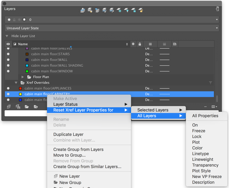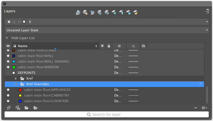 To aide in identifying Xref layers with overrides, a new Xref Overrides layer filter is available. Simply select the Xref Overrides filter to see a list of all the Xref layers in the drawing with applied overrides.
