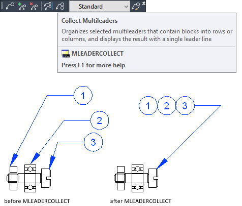Multileader objects with blocks as content can be collected and attached to one landing line. Using MLEADERCOLLECT, multileaders can be collected horizontally, vertically, or within a specified area depending on your drawing needs.