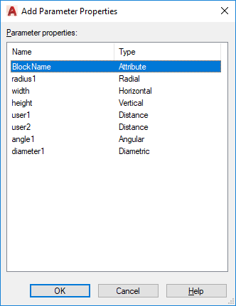 Displays the names of parameters available to add to the block properties table.