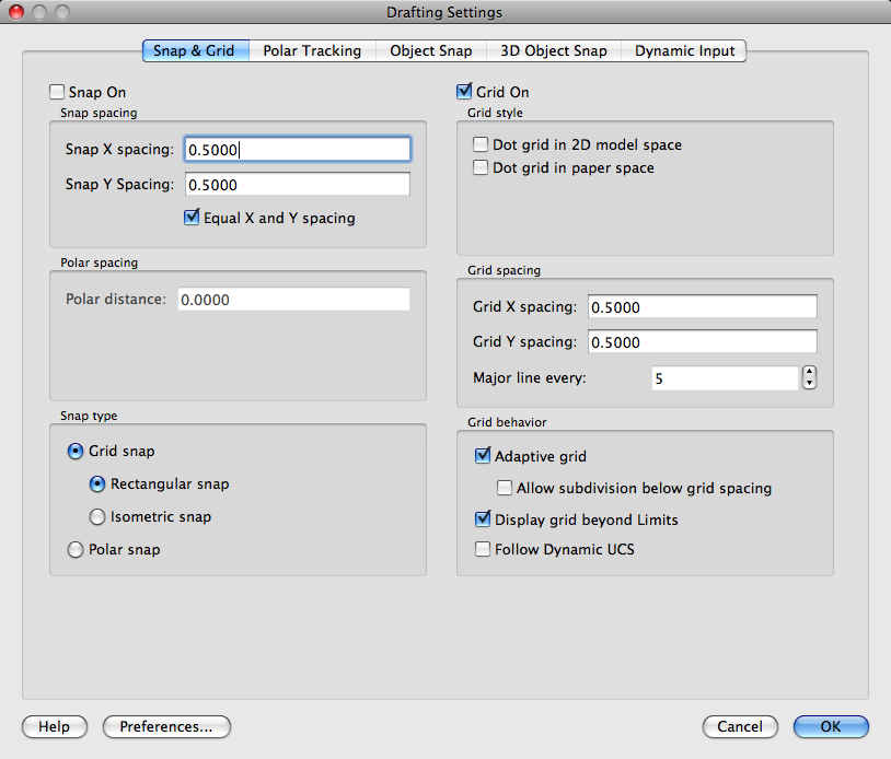 Sets the snap increment distance when PolarSnap is selected under Snap Type & Style. If this value is 0, the PolarSnap distance assumes the value for Snap X Spacing. The Polar Distance setting is used in conjunction with polar tracking and/or object snap tracking. If neither tracking feature is enabled, the Polar Distance setting has no effect. (POLARDIST system variable)