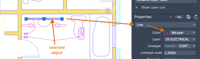 Notice that the current properties for the selected object are displayed in the palette. You can change any of these properties by clicking and changing the setting. A property that is set to "ByLayer" inherits its setting from the layer. In the previous example, the objects that were created on the 20 ELECTRICAL layer are purple because that is the default color of the objects on that layer.