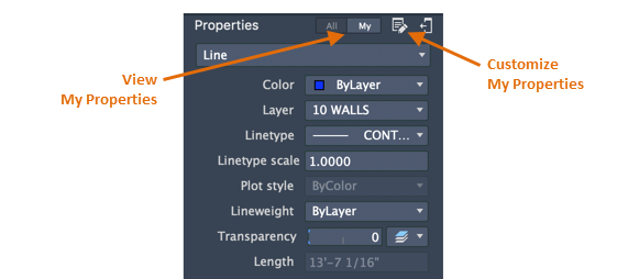 You can switch the Properties Inspector to display all properties for the selected objects, or to display a personalized list of properties. Set up your personalized list of properties using the Customize My Properties button.