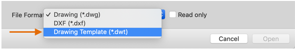 To modify an existing drawing template file, click Open, specify Drawing Template (*.dwt) in the Select File dialog box, and choose the template file.