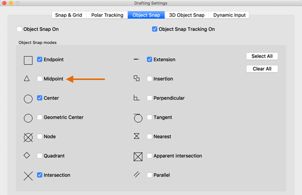 Object snap tracking | Tracks the cursor horizontally and vertically from object snap locations. |