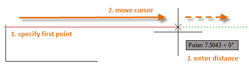 For example, after you specify the first point of the line below, move your cursor to the right, and then enter a distance in the Command window to specify a precise horizontal length for the line.