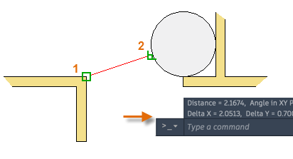 During a command, you can align points both horizontally and vertically from object snap locations. In the following illustration, you first hover over endpoint 1 and then hover over endpoint 2. When you move your cursor near location 3, the cursor locks into the horizontal and vertical location shown.
