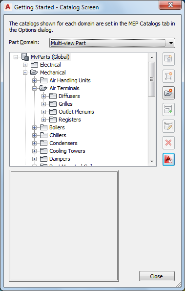 When selecting a part to create or modify, the Getting Started - Catalog Screen dialog box detects the part domain, and guides you by activated icons to ensure that you use the correct building environment. Icons are activated based on the selected domain and part in the part catalog browser, whether parametric or block-based. For example, if you select an MvPart part catalog, both the New Block Part and New Parametric Part icons are available. However, if you select a component part catalog such as duct or cable tray, only the New Parametric Part icon is available.