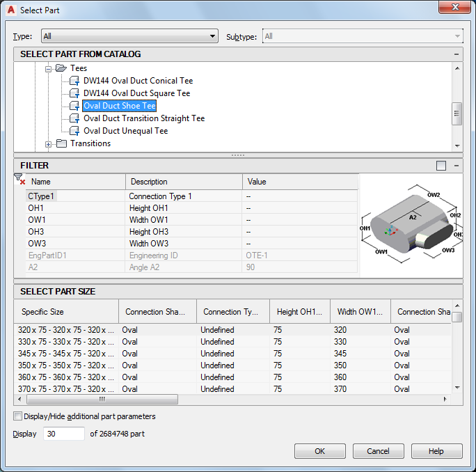 Under Select Part from Catalog, the dialog box organizes duct fittings based on shape type.