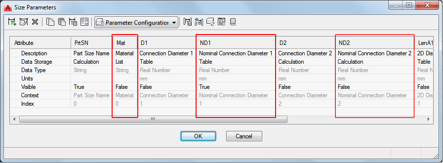 In the Parameter Configuration mode of the Size Parameters dialog box, you can also add non-graphical parameters to the part family. For example, you might want to add information about materials or manufacturers.