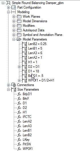 The model parameters of a parametric part define the default part size of the model and act as placeholders for the actual part sizes that you define later. In turn, the size parameters of the part define the actual part sizes. There is a direct connection between the model parameters and the size parameters. When you add a model parameter to the part model, the software adds a corresponding size parameter as well.