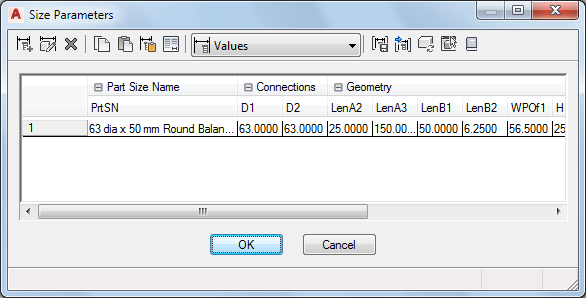 - Values. You use this mode to view and change the values of parameters when they are stored as lists, tables, and constants. You define multiple part sizes by entering multiple values for the size parameters. You can enter the values manually or copy and paste them from another part open in Content Builder, from a part open in Catalog Editor, or from a spreadsheet. For connector parameters, you can also insert the corresponding sizes for the segments used by default during layout.