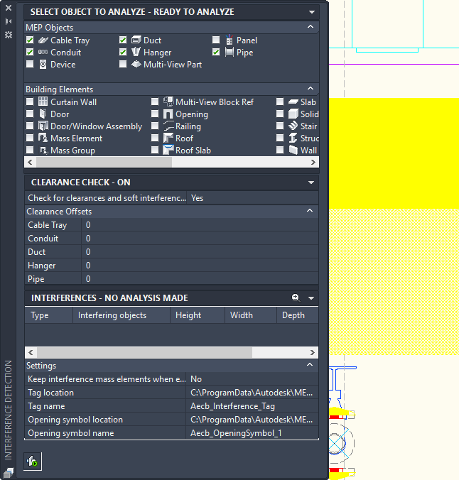 Note: The Interference Analysis mode works on a per drawing basis. If you switch to another drawing, the Interference Detection palette will be updated, based on the currently active drawing.