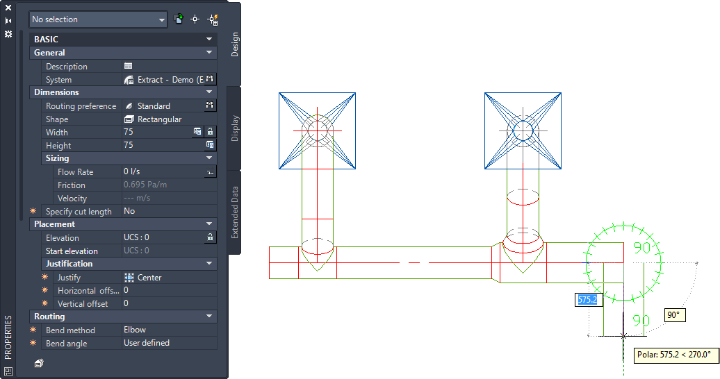 If you have assigned flow values to outlet equipment, you can use the instant sizing tool to calculate sizes for ductwork as you draw duct runs. You can also use the instant sizing tool when modifying existing duct runs.