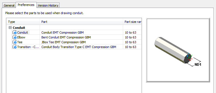 A conduit part routing preference includes one or more connection types (such as set screw) in the available part sizes for conduits and fittings. A preview of the selected part displays to the right of the dialog box. The image to the right provides a graphical representation of the selected part.