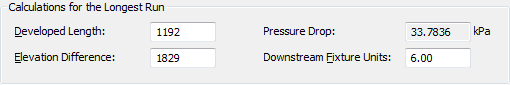 The Calculations for the Longest Run section of the Size Supply Plumbing Line dialog box contains the non-editable, calculated values for the longest run.