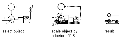 As an example, in the following procedure you decrease the size of a schematic symbol by half, scaling it by a factor of 0.5. The numbers enclosed in parentheses refer to the illustration that follows the procedure.
