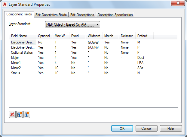 The software provides several default layer standards based on industry-standard layering conventions (for example, MEP Object - Based on AIA, and BS1192 - AUG Version 2). When you create a layer based on a layer standard, the name of the layer has several parts separated by delimiters, such as hyphens. Each part of the name is determined by the rules that are set in the layer standard definition. The default layer standard definitions for AutoCAD MEP toolset are based on common industry layer standards. For example, according to the MEP Object layer standard, the layer name for duct is M-Duct-Std.