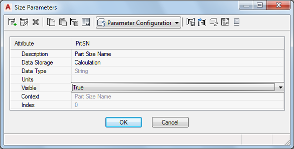 Note: The default data storage type for the PrtSN (Part Size Name) attribute is Table; however, you can change the data storage type to Calculation. Defining the PrtSN attribute as a calculated value enables you to define the name of each part size based on the values of other attributes, such as height and width, and provides additional options in the Blocks & Names section of the block-based building environment.