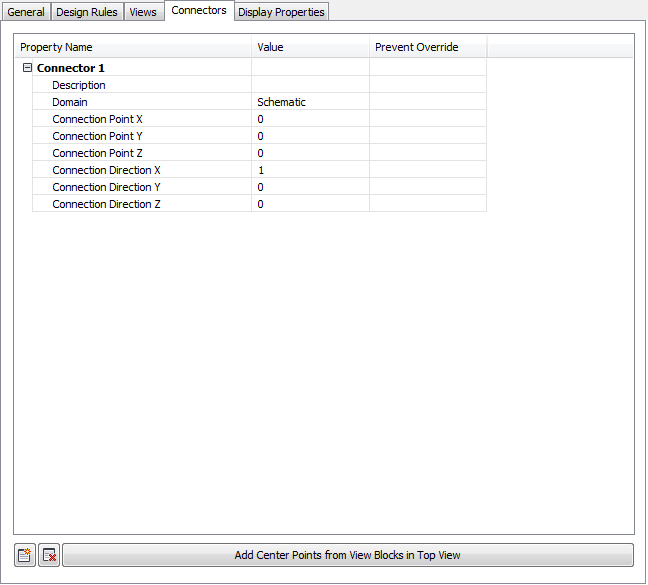 - Specify values for connection points X, Y, and Z, or click Add Center Points from View Blocks in Top View to create a centered connector.