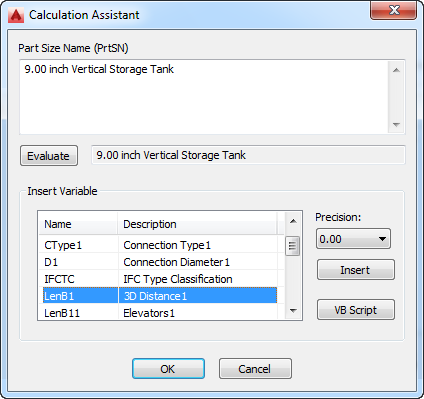- At the top of the dialog box, click the value for Part Size Name (PrtSN), and enter inch Vertical Storage Tank.