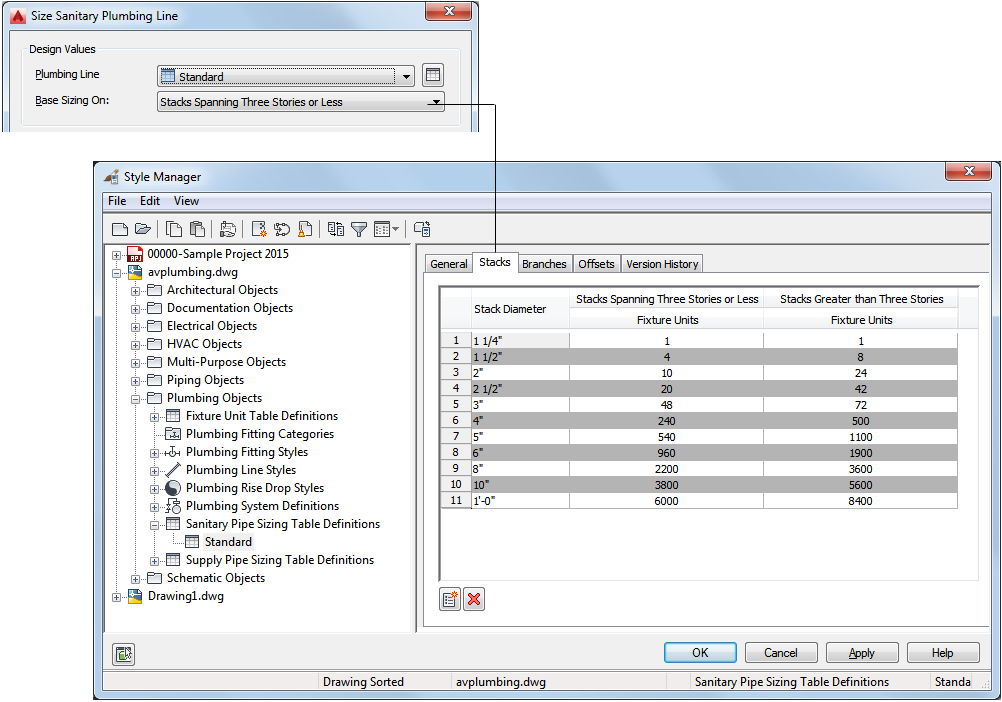 When you define your sanitary run as a stack spanning 3 stories or less, or more than 3 stories, the plumbing module performs the sizing calculations using the information on the Stacks tab in the sanitary plumbing line sizing table (pipe sizing table), whose definitions can be found in Style Manager.