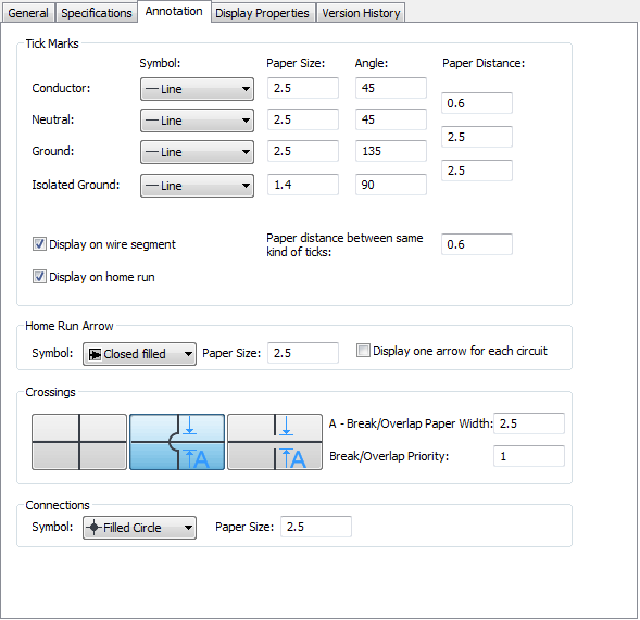 - Under Tick Marks, select a symbol type, and enter a tick mark size and angle for conductor, neutral, and ground.
