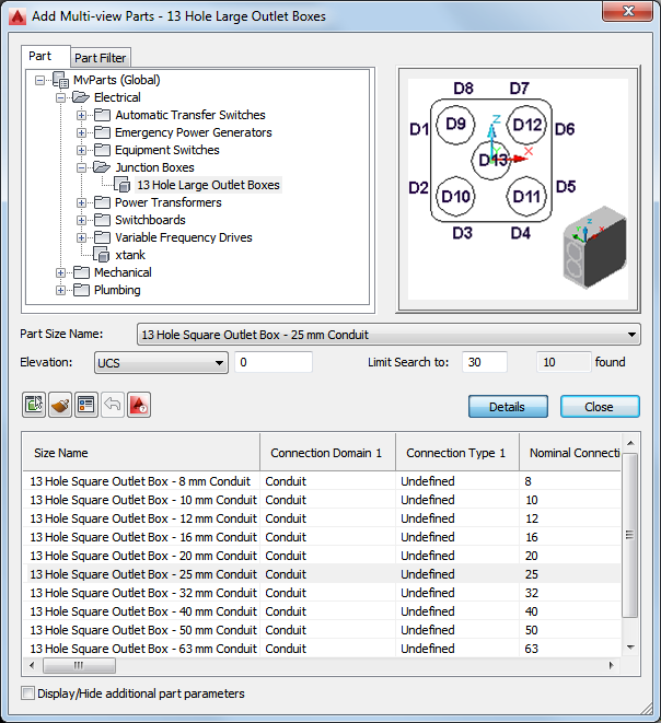 In the Add Multi-view Parts dialog box and Multi-view Part Modify dialog box, you can also use the Part Filter tab to specify part properties to query a part family to find a specific part size. You can view the part sizes available in a part family by clicking Details. The available part sizes are presented in an easy-to-navigate part size table. Select Display/Hide additional parameters to show all the parameters in the table.