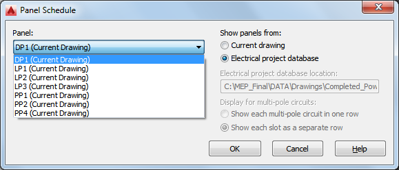 To generate a panel schedule for a panel that does not reside in the current drawing, you must specify an electrical project database (if one has not already been set) on the Electrical Project Database tab of the Electrical Preferences dialog box.