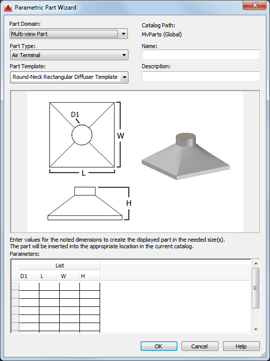 A part template is a fully configured and fully dimensioned parametric part that has a basic model but does not have any part sizes. The imperial and metric catalogs in AutoCAD MEP toolset include part templates for several, commonly used MvParts (for example, air terminals and pumps) and fittings. Using the Parametric Part Wizard, you can quickly create a new parametric part with custom sizes based on a part template.