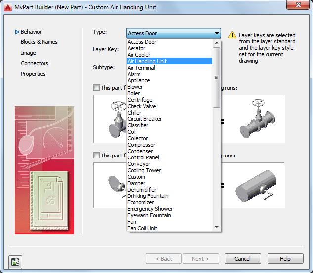 You assign a layer key to the part family for automatic layer mapping of part sizes. The same layer key is used for all part sizes of a part family. When you add a part that has a specified layer key to a drawing, the part is placed on the layer to which it is mapped. For example, according to the Aecb layer standard (AecbLayerStd4.dwg) and associated Mech - AIA 256-color layer key style, the Air Handling Unit layer key is mapped to the M-HVAC-Eqpm layer. When you add an air handling unit to your drawing, it is assigned to the M-HVAC-Eqpm layer. Only those layer keys predefined in the layer key style selected for the current drawing are available for selection in Content Builder. To learn more about layer keys, see .