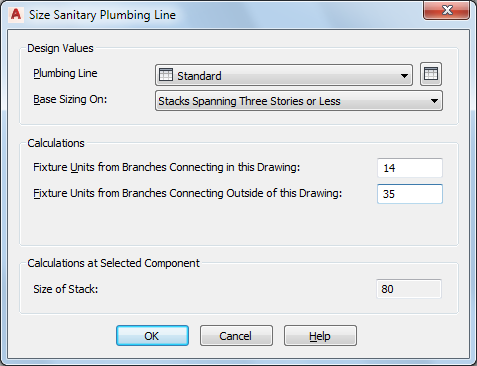 The Fixture Units from Upstream Stack value is the result of all connected fixtures in the drawing. To calculate this value, in Fixture Units from Branches Connecting Outside of this Drawing, enter the calculated sum from the floor above. When working with a multiple story building, the drawing for each floor in the sanitary waste system should be saved in a separate file and must be calculated separately. For more information, see Sanitary Pipe Sizing for Multiple Floors.