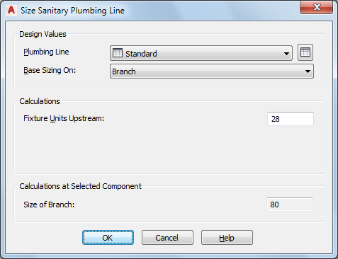 - Enter the result for Fixture Units from Branches Connecting Outside of this Drawing. The selected run is sized appropriately, and the value for Size of Plumbing Line is updated accordingly.
