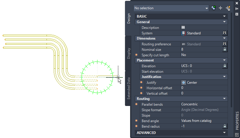 The Properties palette provides 2 options for configuring parallel bends: Concentric and Fixed radius. These options let you specify the type of bend radius for use in a parallel conduit run.