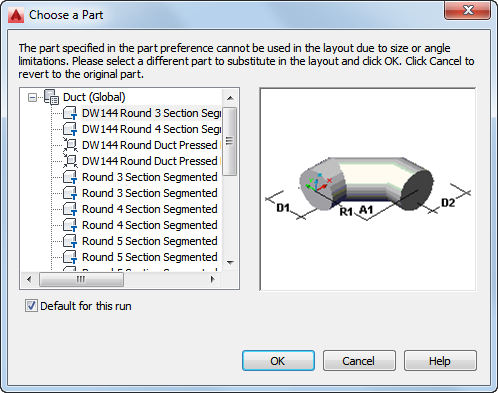 The Choose a Part dialog box displays if you try to add or modify a part in a run that is not stored in your preferences. You will be prompted to make a substitution from the catalog. The following example shows the dialog box in the Ductwork domain in the Global profile: