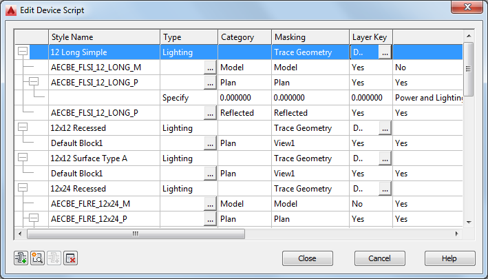The Category property in the script does not display in the Style Manager. Device categories are the mechanism by which you group the devices (device styles) in the Select Device worksheet, making it easier to browse the available devices. You create and manage device categories directly in the worksheet; for more information, see Creating Categories in AutoCAD MEP toolset.