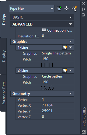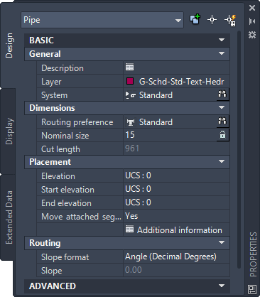 This section defines the properties on the Design tab of the Properties palette to use to modify the piping system. The Design tab is divided into two sections: Basic and Advanced.