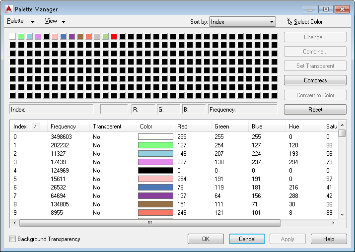 Click Raster Tools The Palette Manager dialog box displays the color palette for the map. |