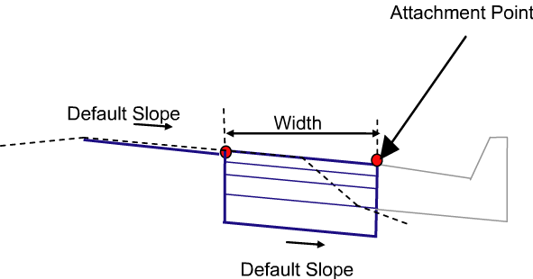 The following illustration shows a situation with an overlay offset profile. (If the Overlay Profile is given, then the slope is calculated between the profile elevation at the inside edge of the overlay and the attachment point.)