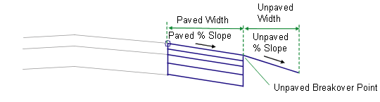 In layout mode, this subassembly displays the links comprising the shoulder for the normal crown roadway condition, based on the input parameters provided. If a numeric value is given for the Paved %Slope, the paved portion of the shoulder is calculated based on that value. Otherwise the default value of -6% is used.
