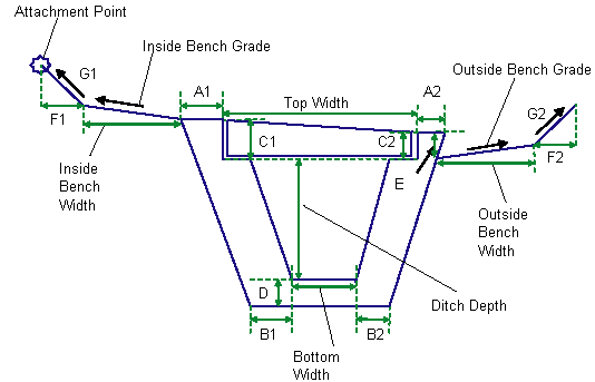 | Inside Bench Grade | Cross grade of the (optional) inside bench. It is measured away from the ditch structure edge, and a positive slope indicates rising bench from the ditch | Numeric, Grade type | 4% |